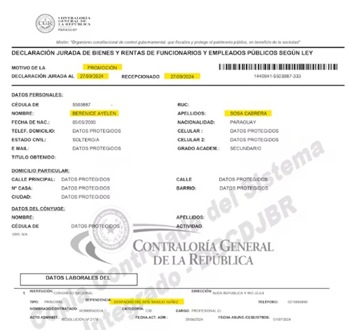 El presidente del Senado, Basilio “Bachi” Núñez, ha otorgado dos incrementos salariales sustanciales a su sobrina Berenice Sosa Cabrera en menos de un año. La joven de 19 años, que solo cuenta con título de bachiller, percibe actualmente una remuneración mensual de G. 9,5 millones como funcionaria del Congreso Nacional, en un caso que evidencia prácticas de nepotismo en la institución legislativa.