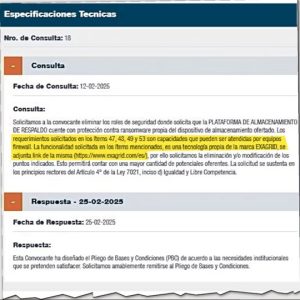 Ante los cuestionamientos, el TSJE se limitó a responder que el Pliego de Bases y Condiciones estaba diseñado conforme a las necesidades institucionales, sin abordar las acusaciones de direccionamiento. El informe de evaluación posteriormente confirmó que Technoma efectivamente presentó equipos de la marca Exagrid, coincidiendo con las sospechas iniciales sobre un posible favorecimiento en el proceso.
