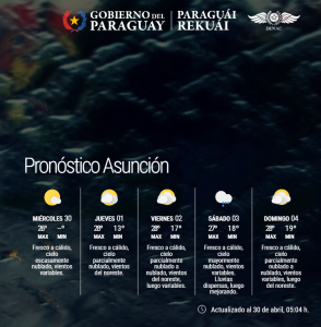 Sin embargo, se espera un cambio para el viernes. De acuerdo con la Dirección de Meteorología, aumentaría la chance de lluvias y tormentas, especialmente en el sur de la región Oriental y en la zona occidental del país.