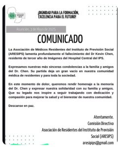La comunidad médica del Instituto de Previsión Social (IPS) fue golpeada nuevamente este fin de semana por el fallecimiento de un médico residente. Se trataba del doctor Kevin Chen, quien cursaba el tercer año de la especialidad de Imágenes en el Hospital Central. La noticia fue confirmada por la Asociación de Médicos Residentes del IPS (Aresips).