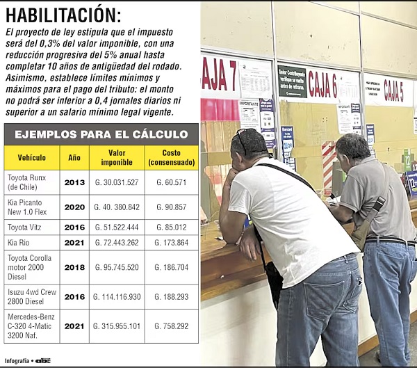 El esquema de costos propuesto por la ley define que una motocicleta de estreno pagará un jornal diario; si es usada, entre 0,5 y 0,8 jornales. En el caso de los automóviles, el monto va desde seis jornales para vehículos nuevos hasta dos para los más antiguos. Esta fórmula busca reflejar con mayor precisión el valor real del rodado y su impacto en la vía pública.