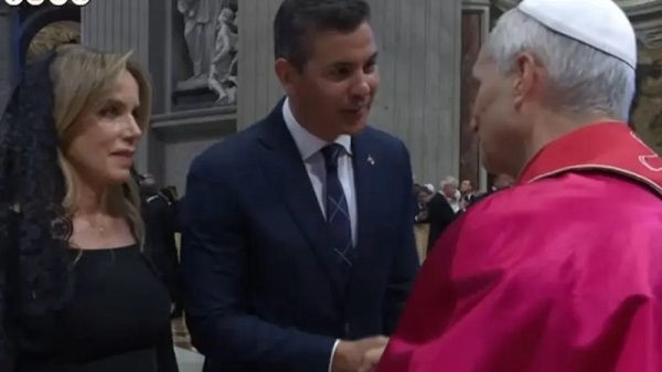 El mandatario paraguayo asistió a la ceremonia acompañado de su esposa, Leticia Ocampos, y fue recibido por el pontífice con gestos de cordialidad. El saludo tuvo lugar a las 7:45, hora paraguaya, como parte del protocolo oficial previsto para los jefes de Estado y autoridades religiosas y diplomáticas.