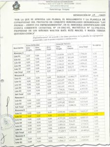 El proyecto urbanístico aprobado contempla 31 lotes repartidos en seis manzanas. Según el documento firmado por el intendente cartista Emigdio Ruiz Díaz, ninguna de esas parcelas cuenta con edificaciones. Pero en uno de esos lotes –el N.º 2 de la Manzana D– se ubica precisamente la vivienda del presidente.
