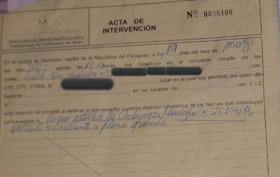 La presunta infracción, notificada el 19 de mayo, se produjo apenas seis días después del incidente ocurrido durante la entrega de motos y motocarros en el Jardín Botánico. Según el acta de intervención, Schaerer habría incumplido la ordenanza N° 26.104/91, relacionada con el reglamento general de construcción y la aprobación de planos en la capital.