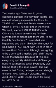 Según el republicano, el pacto firmado dos semanas atrás redujo del 145% al 30% los impuestos estadounidenses sobre productos chinos, mientras que Pekín bajó sus aranceles del 125% al 10%. Este acuerdo debía mantenerse por tres meses como tregua, mientras avanzaban nuevas negociaciones. Sin embargo, Trump no especificó qué cláusula habría sido incumplida.