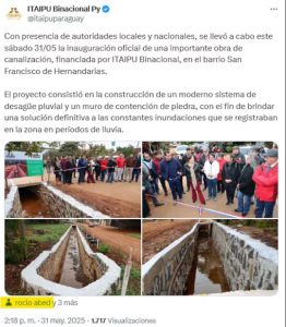 El acto de habilitación se realizó el sábado 31 de mayo en el barrio San Francisco, con presencia de autoridades cartistas locales. La obra, promocionada como “moderna”, consiste en un canal con muros de piedra cuyo objetivo es mitigar las inundaciones durante las lluvias, según explicó la binacional en un comunicado oficial.