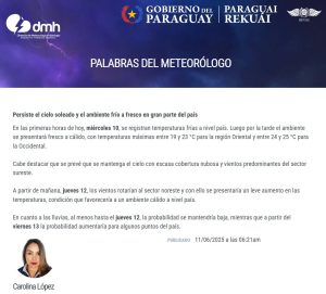 Este tipo de condiciones climáticas, con mañanas frías y tardes más templadas, son típicas del periodo de transición hacia el invierno paraguayo. No obstante, la variabilidad térmica obliga a mantenerse atentos a los cambios de temperatura.