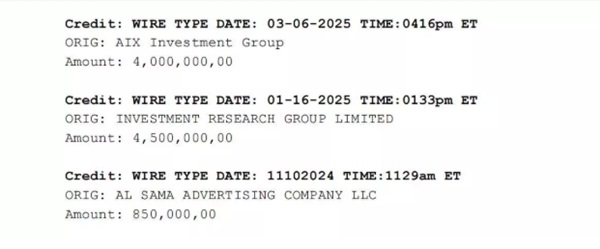 Entre las transferencias más significativas se destacan cuatro millones de dólares desde AIX Investment Group el 6 de marzo de 2025, y 4,5 millones desde Investment Research Group Limited el 16 de enero del mismo año. Otras operaciones incluyen 1,7 millones de AIX Investment Group en noviembre de 2024 y múltiples transferencias desde Al Sama Advertising Company LLC por montos que superan los tres millones de dólares.