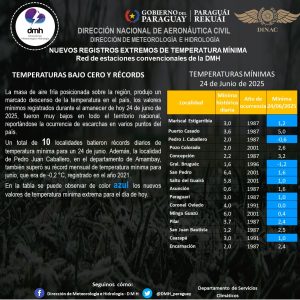 Uno de los casos más llamativos se dio en Pedro Juan Caballero, donde se alcanzó una temperatura mínima de -0,6 °C, rompiendo el récord mensual para junio que databa del año 2021, cuando se había registrado -0,2 °C. Esto convierte a la jornada del martes en la más fría de junio en la historia reciente de esa ciudad.