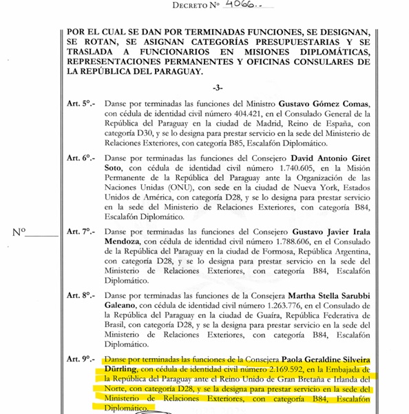 El Poder Ejecutivo firmó el Decreto N.º 4066, con fecha 20 de junio de 2025, por el cual se da por terminadas las funciones de Silveira Dürrling en la Embajada paraguaya en Londres. A través de la misma disposición, se la reasigna para prestar funciones en la sede del Ministerio de Relaciones Exteriores, en Asunción, con categoría presupuestaria B84, estas determinaciones igualmente aún no se hacen efectivas y la consejera con posibles títulos mau sigue activa en la diplomacia paraguaya.