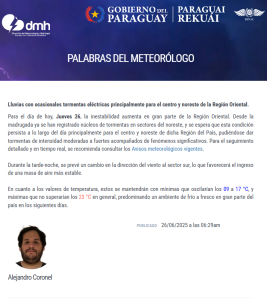 El pronóstico extendido señala que las inestabilidades persistirán. Para mañana viernes, se prevén lluvias más intensas y nuevas tormentas que afectarían a departamentos ubicados hacia el noreste paraguayo, reforzando la necesidad de estar atentos a los boletines meteorológicos.