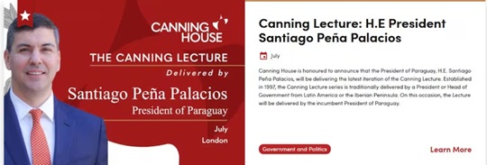 Imagen siguiente Santipeñaviaje Canning House anunció que el presidente de Paraguay, Santiago Peña, será el próximo orador de la “Canning Lecture”.