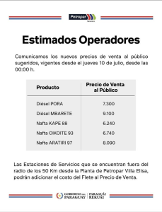 Desde la institución también aclararon que las estaciones ubicadas a más de 50 kilómetros de la planta central en Villa Elisa podrán aplicar un adicional por flete. Esto significa que los precios en el interior del país podrían variar dependiendo de la distancia, afectando especialmente a las zonas más alejadas del área metropolitana.