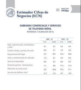 La economía paraguaya continúa mostrando señales de recuperación sostenida en el ámbito comercial. De acuerdo con el último reporte del Banco Central del Paraguay (BCP), el Estimador de Cifras de Negocios (ECN) registró un crecimiento acumulado del 6% en los primeros cinco meses del 2025, con una variación interanual del 4,1% en el mes de mayo.