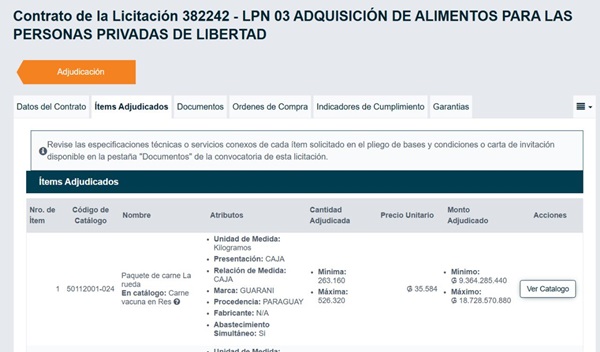 La publicación incluye capturas de pantalla de licitaciones públicas donde aparece el Frigorífico Guaraní, propiedad de Pettengill, como proveedor estatal. “Encima tiene un frigorífico, se supone que debe conocer los precios, además es super proveedor del Estado”, expresó.