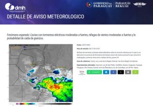 El área de cobertura incluye el centro, sur y este de la Región Oriental, así como el sur de la Región Occidental. Las condiciones inestables podrían provocar lluvias intensas, tormentas eléctricas con descargas frecuentes, ráfagas de vientos moderadas a fuertes y posible caída de granizos.