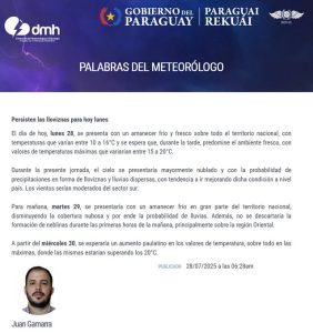 Según la Dirección de Meteorología, se espera que el ambiente siga mayormente nublado durante el resto del día, con escasas variaciones térmicas. Las temperaturas máximas no superarían los 20°C en ningún punto del territorio nacional.