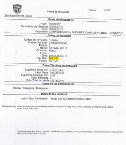 Según una revisión de documentos oficiales de la Municipalidad de Luque realizada por el periodista Alfredo Guachiré, el predio de más de 21.000 metros cuadrados donde funcionan las oficinas de la confederación tiene un valor fiscal superior a los 129.000 millones de guaraníes. Sin embargo, en el catastro municipal no consta ninguna edificación, como si el lugar estuviera vacío.