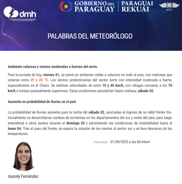 El primer viernes de agosto llega con una combinación de mañanas frescas y tardes calurosas en gran parte del país. La Dirección de Meteorología anuncia temperaturas que oscilarán entre los 19°C y los 35°C, dependiendo de la región, marcando un arranque de mes con clima más típico del verano que del invierno.