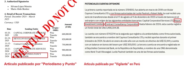 La investigación de @minastirpy encontró similitudes preocupantes con un caso peruano donde se utilizaron los mismos nombres de empresas para acusar a una ambientalista de tener cuentas offshore. La Fiscalía peruana investiga actualmente la producción de documentos no auténticos en ese caso.