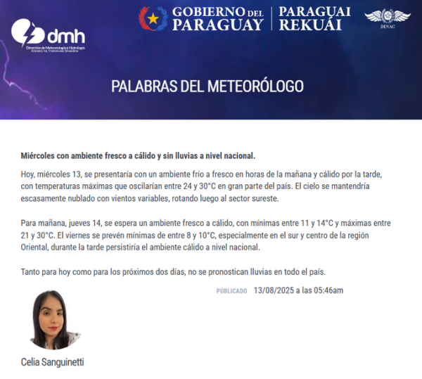 La jornada de este miércoles se presenta con condiciones de estabilidad en todo el territorio nacional. Según la Dirección de Meteorología e Hidrología, el cielo permanecerá despejado o con escasa nubosidad, y no se prevén precipitaciones durante el día.