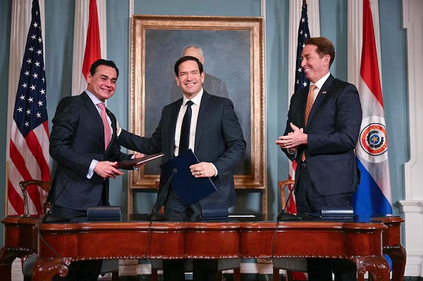El secretario de Estado de Estados Unidos, Marco Rubio (centro), y el ministro de Relaciones Exteriores, Rubén Ramírez Lezcano (izquierda), posan para una foto tras firmar un memorando de entendimiento en la Sala de Tratados del Departamento de Estado en Washington, D.C., el 14 de agosto pasado. También aparece en la imagen el subsecretario de Seguridad Nacional de EE. UU., Troy Edgar (derecha). 141602+0000 JIM WATSON