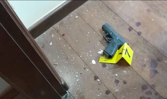 Un arma de fuego y rastros de sangre en la habitación del diputado Eulalio "Lalo" Gomes, en su casa de Pedro Juan Caballero, luego del allanamiento que derivó en su fallecimiento el 19 de agosto de 2024. Foto: Gentileza