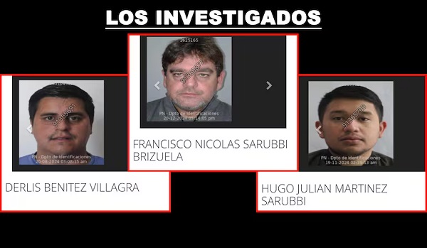 El exintendente de Caazapá, Francisco Nicolás Sarubbi Brizuela, de 56 años; su supuesto secretario, Derlis Benítez Villagra, de 33 años, y uno de sus sobrinos, Hugo Julián Martínez Sarubbi, de 28 años, investigados por supuesto narcotráfico internacional. ABC