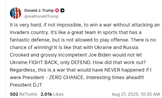 Según Trump, la Casa Blanca restringió a Ucrania a una posición exclusivamente defensiva, sin permitirle contraatacar de manera directa a las fuerzas rusas. “No hay ninguna posibilidad de ganar”, escribió, al señalar que esa limitación redujo las opciones de éxito de Kiev frente a Moscú.