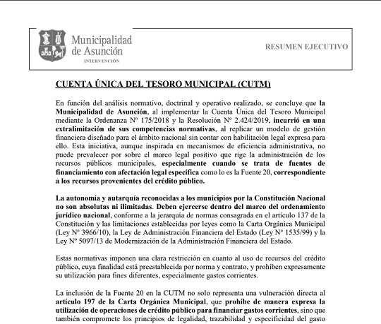 El Ministerio del Interior informó este miércoles, a través de sus redes sociales, que ya se encuentra disponible para consulta ciudadana el informe de intervención a la Municipalidad de Asunción. El documento, elaborado por el interventor Carlos Pereira, revela desvíos de fondos, una crisis financiera prolongada, falta de control interno y el uso indebido de la cuenta única del Tesoro Municipal.