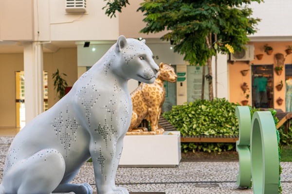 White Jaguar del artista Paulo Ricardo Campos y Onça Dourada de Gard Pam en la exposición JP Floripa 2023. Jaguar Parade y Artivismo Ambiental, ARTERY