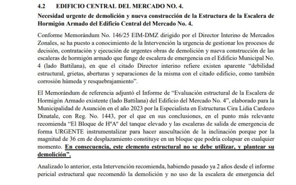 Un informe de la intervención a la Municipalidad de Asunción expuso que la administración de Óscar “Nenecho” Rodríguez mantuvo en silencio durante más de dos años una alerta por riesgo de derrumbe en el edificio central del Mercado 4. La advertencia se refería a la escalera de hormigón armado ubicada sobre la calle Battilana, cuya evaluación pericial ya en 2023 recomendaba su demolición inmediata.
