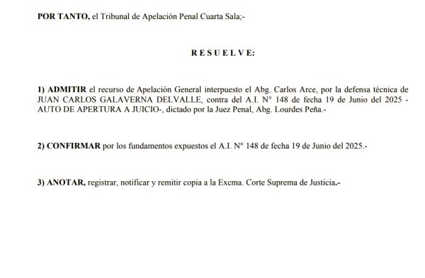 El ex senador colorado Juan Carlos “Kalé” Galaverna enfrentará juicio oral y público por presunta calumnia, luego de que el Tribunal de Apelación Penal, Cuarta Sala, ratificara la resolución de la jueza Lourdes Peña que elevó la causa. La decisión fue unánime entre los camaristas Arnulfo Arias, Arnaldo Fleitas y Adriana Giagni, quienes analizaron el recurso de apelación presentado por la defensa del ex legislador.