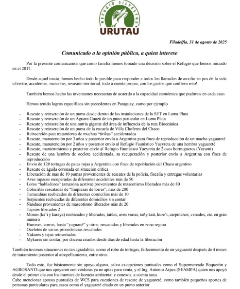 El Refugio Silvestre Urutaú, ubicado en Filadelfia, Chaco, comunicó oficialmente que ya no recibirá más animales debido a la crítica situación económica que atraviesa. La decisión marca un punto de quiebre para uno de los espacios más importantes en el rescate y rehabilitación de fauna silvestre en el país, que desde 2017 venía trabajando en el cuidado de especies amenazadas.