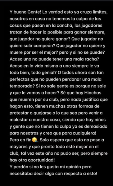Chávez señaló que los futbolistas hacen su mayor esfuerzo en la cancha y que los familiares no deben ser objeto de intimidaciones. Resaltó la gravedad del hecho, recordando que en la casa conviven niños y que la violencia desborda los límites de la pasión deportiva.