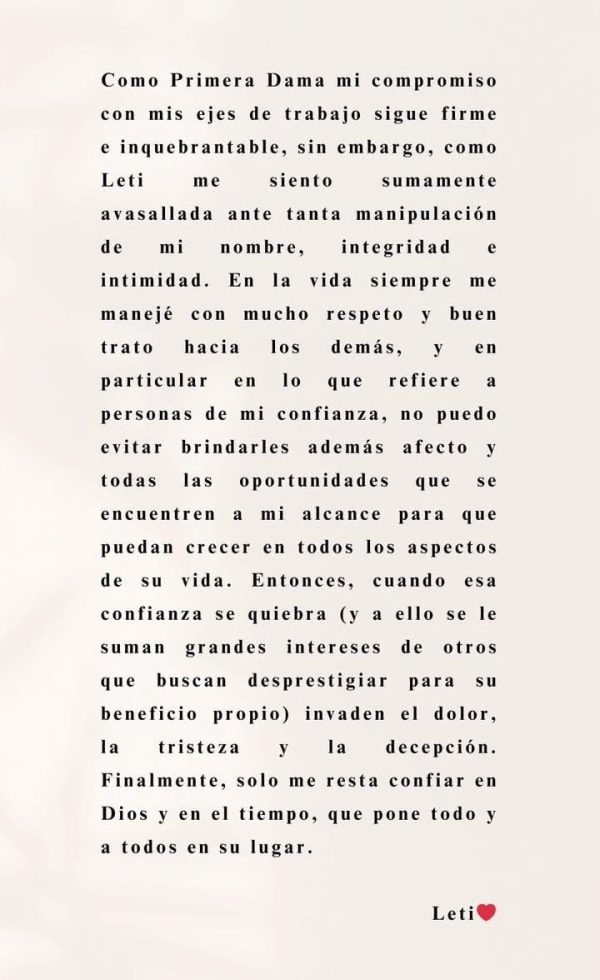 En su pronunciamiento, Ocampos expresó que siempre se condujo con respeto y buen trato hacia los demás, pero que en esta ocasión “se quebró la confianza”, lo que le provoca dolor, tristeza y decepción. “Finalmente, solo me resta confiar en Dios y en el tiempo, que pone todo y a todos en su lugar”, concluyó, firmando el texto con el apelativo “Leti”.