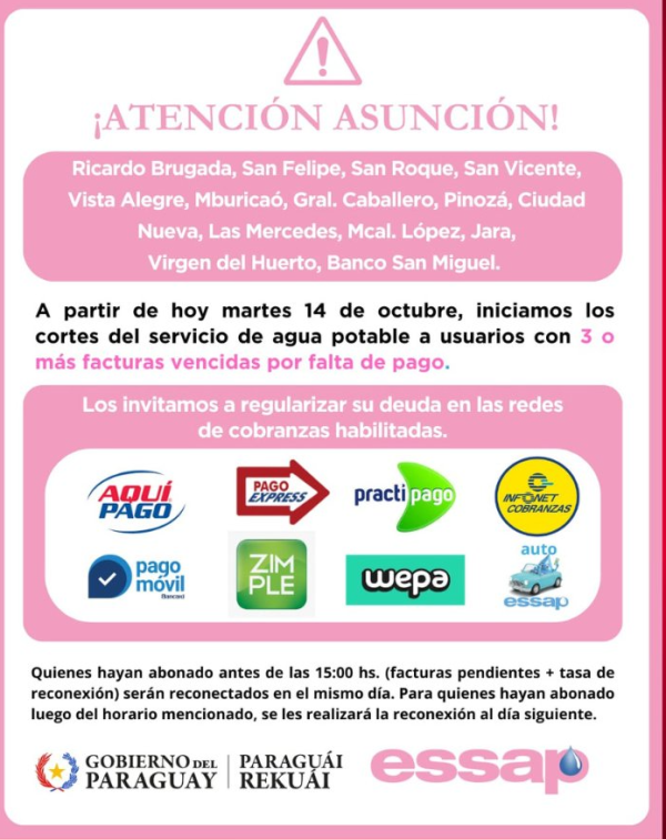 La Empresa de Servicios Sanitarios del Paraguay (Essap) puso en marcha este martes un operativo para cortar el servicio a unos 15.000 usuarios que acumulan más de tres facturas impagas. La medida alcanza tanto a particulares como a instituciones públicas, según confirmó el gerente comercial de la entidad, Óscar Anuar Gosse.