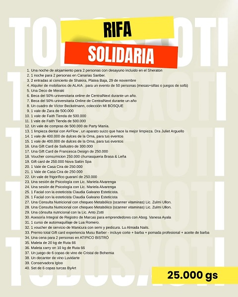 Ante esta situación, se lanzó una rifa solidaria que cuenta con 40 premios importantes. Entre ellos figuran dos entradas para el concierto de Shakira, una noche en el Hotel Sheraton, vales de compra de ropa y otros obsequios donados por colaboradores. El objetivo es reunir los fondos necesarios para cubrir los gastos médicos, traslado y estadía en el vecino país.