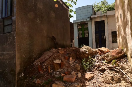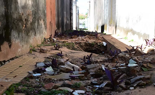 En pasillos se acumulan bloques de cemento y escombros, y se reportan restos óseos a la vista. Sobre la calle Mariano Moras, frente al portón N.º 9, un vertedero irregular degradó la vereda; el retiro con maquinaria pesada dañó el muro perimetral, que hoy presenta un hueco cubierto de forma precaria y una inclinación que expone riesgo de colapso.