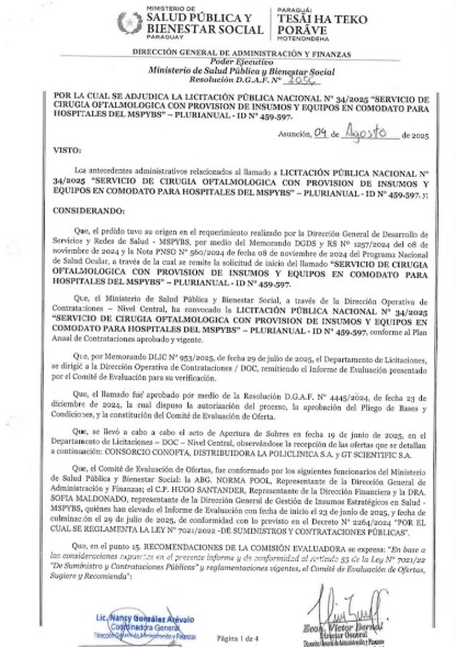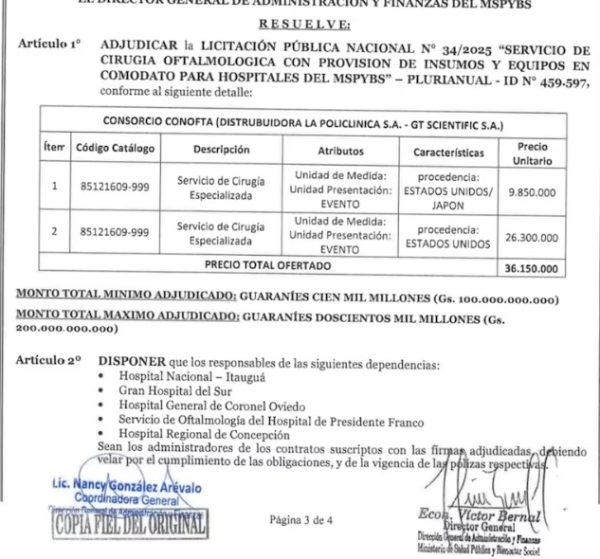 La controversia sobre este convenio, firmado el pasado 1 de septiembre, resurgió en medio de quejas por otras tercerizaciones del MSPBS, como un acuerdo con el Instituto Cardiológico de Corrientes. Filizzola utilizó sus redes sociales para alertar sobre el millonario contrato oftalmológico. La Licitación N° 34/2025 fue adjudicada a Conofta, que se presentó como único oferente. El monto total de G. 200.000 millones (aproximadamente USD 28.3 millones) busca proveer cirugías, insumos y equipos en comodato a hospitales del Ministerio de Salud por un período de tres años.