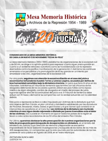 La Mesa Memoria Histórica (1954-1989), integrada por organizaciones de la sociedad civil y de derechos humanos, difundió un comunicado con vistas al 3 de noviembre, fecha que el estronismo usaba para conmemorar el cumpleaños del dictador Alfredo Stroessner.