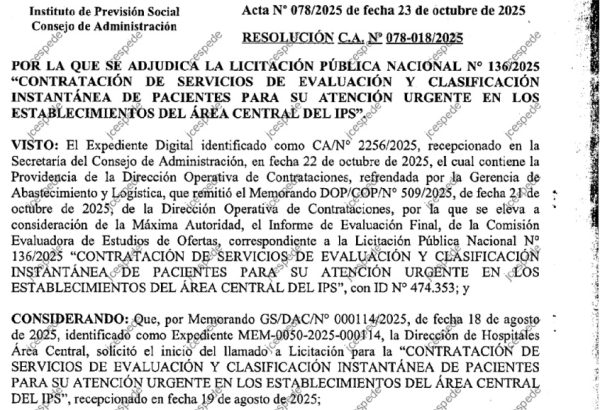 El Instituto de Previsión Social adjudicó la Licitación Pública Nº 474353 (LPN 136-25) para contratar cabinas de triaje y personal técnico en el Área Central. El pliego fija un uso mínimo de G. 17.500 millones y un tope de G. 35.000 millones, equivalente a unos USD 5 millones.