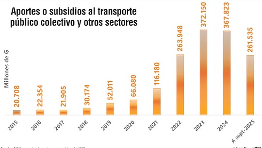 El crecimiento de este aporte se aceleró especialmente desde 2021, cuando el monto superó los G. 116.180 millones, manteniéndose por encima de los G. 367.000 millones en los años posteriores. De enero a septiembre de 2025, el desembolso ya ascendió a G. 261.535 millones. Este ritmo evidencia el peso creciente de los subsidios en el Presupuesto General de la Nación (PGN).
