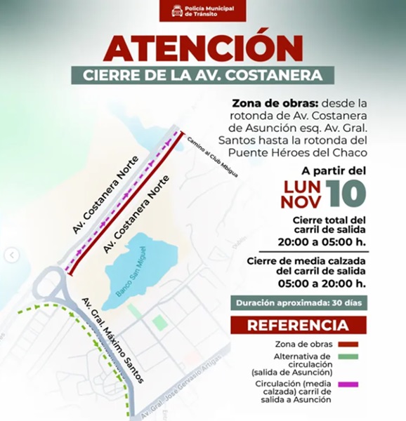 La Municipalidad de Asunción informó el cierre del carril de salida de la avenida Costanera Norte por 30 días, desde hoy, debido a trabajos coordinados entre la ANDE y el MOPC. La intervención forma parte del proyecto de modernización del sistema eléctrico que readecúa cables al paisaje urbano y requiere excavaciones sobre la traza vial.