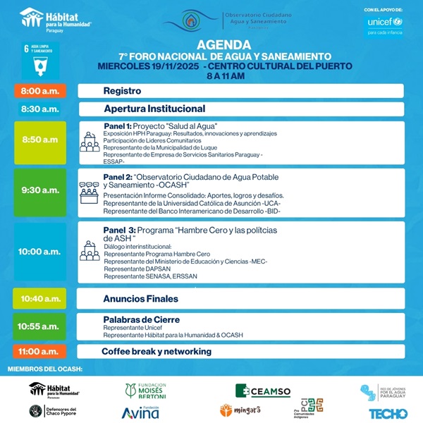 RDN informa que Hábitat para la Humanidad Paraguay y el Observatorio Ciudadano de Agua Potable, Saneamiento e Higiene (OCASH), con apoyo de UNICEF, impulsan el 7° Foro Nacional de Agua y Saneamiento. La actividad se afianza como plataforma de evidencia e incidencia para el sector. Su enfoque prioriza soluciones que parten de la comunidad y que dialogan con las políticas públicas.