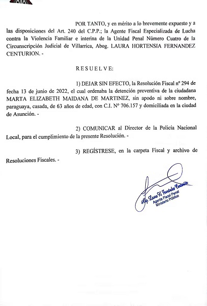 Resolución fiscal que dejó sin efecto la orden de detención preventiva de la docente jubilada. ABC
