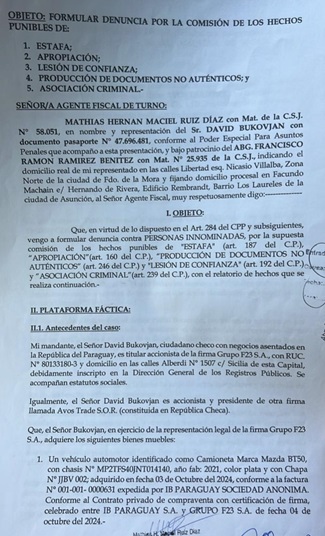 El empresario checo David Bukovjan presentó una denuncia penal contra el empresario argentino Marcelo Demp y el empresario uruguayo Pablo Francisco Berrondo López. Los acusa de presunta estafa, apropiación, lesión de confianza, producción de documentos no auténticos y asociación criminal. Ambos denunciados están radicados en Paraguay y mantienen actividades vinculadas al sector agroindustrial.
