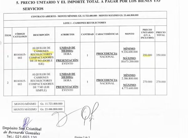 Según los datos publicados por Contrataciones Públicas, la compra inicial de Nenecho benefició a las firmas Cóndor SACI y Rieder & CIA SACI, que recibieron montos superiores a G. 13.300 millones y G. 14.000 millones, respectivamente, por la provisión de camiones compactadores y vehículos con volquete. No obstante, en 2024 la Municipalidad también adjudicó contratos millonarios para alquiler de camiones a las empresas El Palacio SA y Depósito San Cristóbal, con tarifas que, por jornada laboral completa, pueden acercarse al costo anual de un vehículo nuevo.