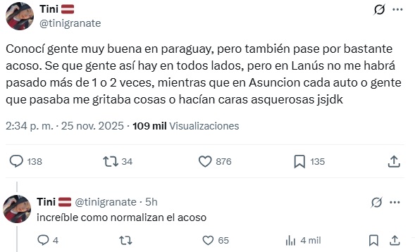 “Conocí gente muy buena en Paraguay, pero también pasé por bastante acoso. Sé que gente así hay en todos lados, pero en Lanús no me habrá pasado más de 1 o 2 veces, mientras que en Asunción cada auto o persona que pasaba me gritaba cosas o hacía gestos desagradables”, señaló la joven en sus publicaciones.