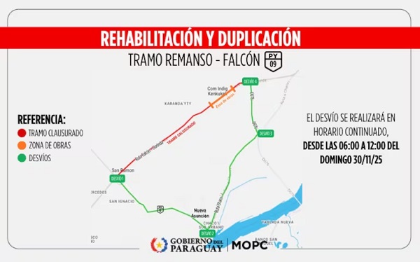 La ruta Remanso–Falcón registrará desvíos obligatorios este domingo debido a trabajos finales de rehabilitación y duplicación. El Ministerio de Obras Públicas y Comunicaciones (MOPC) informó que la medida se aplicará el 30 de noviembre, entre las 06:00 y las 12:00, en un tramo de la ruta PY09. Esta vía suma cuatro años de obras y un incremento considerable de costos, además de reparaciones previas a su inauguración.